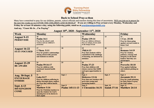 As students, families, and those a part of schools begin this school year, we want to keep them in prayer. This year, we're praying for 21 days with scriptural focuses, specific requests using the guide below and based on requests that are shared via pray@turningpointbfc.org or our prayer request page.